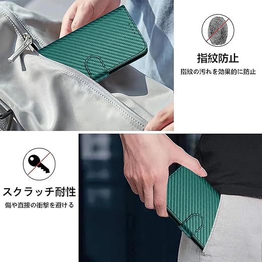 【上質な素材】このケースの外装は高品質のPU素材とカーボンファイバーの質感で作られており、手に馴染み、傷防止、指紋防止、優れた熱と衝撃吸収性を持っています。内側はソフトなTPU素材で携帯電話を保護し、着脱も簡単です。また、ケースは携帯電話