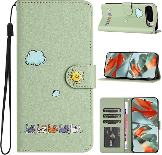 CASAFUNY For Google Pixel 10 Pro XL ケース 手帳型 おしゃれ カバー ピクセル10プロ XL スマホケース 人気 耐衝撃 PUレザー 携帯カバー お洒落 可愛い猫柄 携帯ケース マグネット式 カード収納 スタンド機能 軽量 スマホカバー(ライトグリーン) a