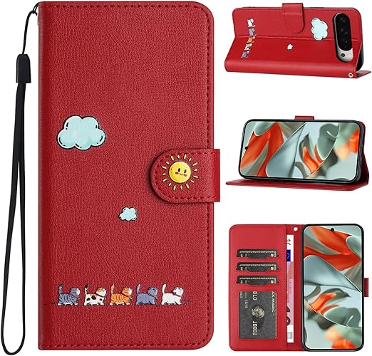 CASAFUNY For Google Pixel 10 Pro XL ケース 手帳型 おしゃれ カバー ピクセル10プロ XL スマホケース 人気 耐衝撃 PUレザー 携帯カバー お洒落 可愛い猫柄 携帯ケース マグネット式 カード収納 スタンド機能 軽量 スマホカバー(レッド) a