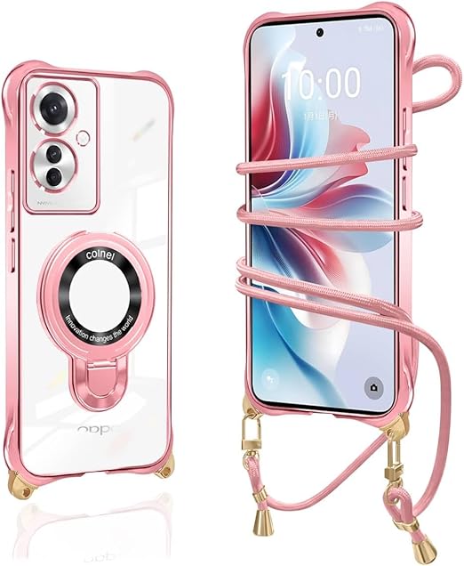 OPPO Reno11 A ケース クリア ショルダー 透明 リング付き docomo oppo reno 11A カバー スタンド機能 マグネット搭載 オッポレノ11a スマホケー ス 120度反転スタンド 耐衝撃 米軍規格 紐付き 斜めがけ 織りストラップ付き ネックストラップ ショルダー 縦/横 2WAY 長さ調整可能 取り外し可能 紛失防止(ローズゴールド) a