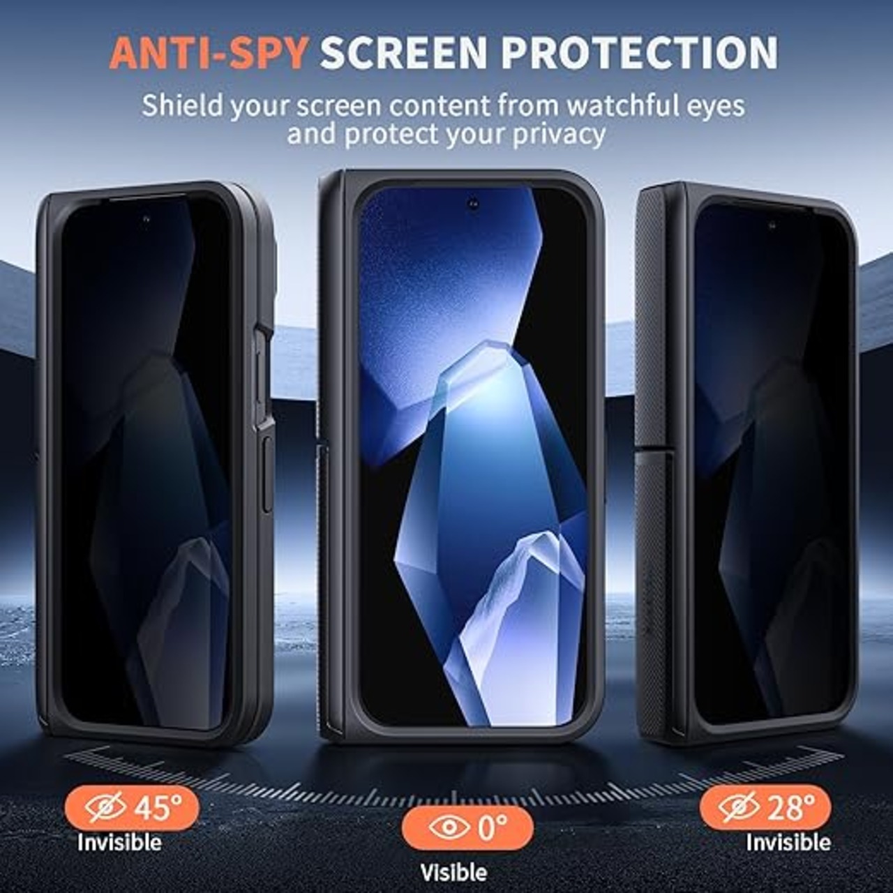 [アップグレードプライバシーガラススクリーンプロテクター】このPixel 9 Pro Foldケースには、高強度プライバシー強化ガラスプロテクターが付属しており、傷つきやすくも高価な携帯電話のスクリーンとレンズを「二重の保護」で保護し、傷や衝撃、潜在的なダメージから守ります。覗き見防止スクリーンフィルムは、スクリーンの前面だけが見える45°の視野角を提供し、他の人があなたのプライベートな機密情報を覗き見するのを防ぎます。