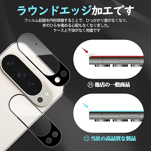【対応機種】Google Pixel 9 Pro カメラフィルム2枚。【注意】この電話の画面の端は湾曲しているため、保護フィルムのサイズが丁度良い場合、しっかりと貼り付けられず、白いエッジやシェルとの干渉などの問題があるため、保護フィルムは画面よりも小さいです。