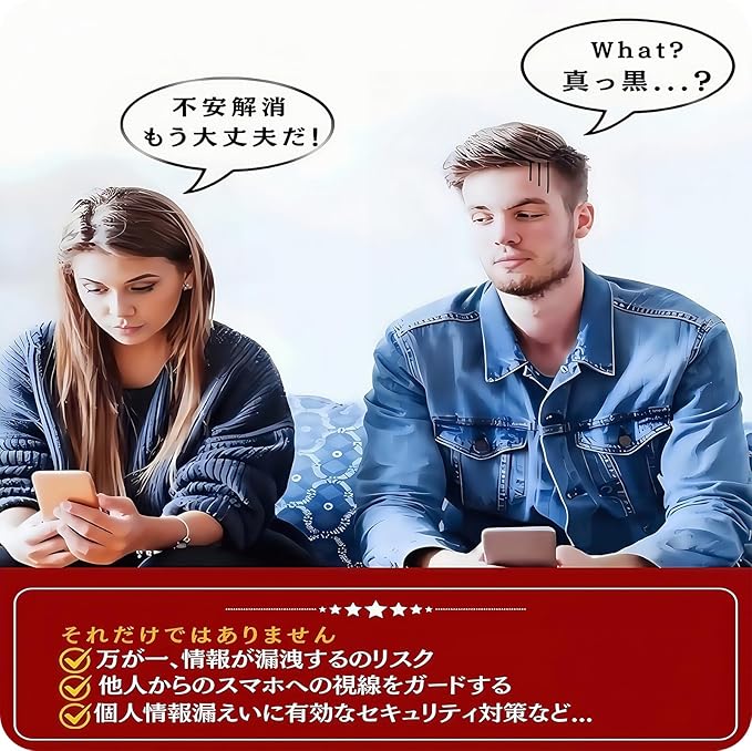 「覗き見防止・プライバシーを常に守る」覗き見防止技術(ブラインド技術)を搭載され、視野角度が左右約28°となり、28°を超えると画面が真っ黒になります。左右の視野からの視線を防ぎ、画面のプライバシーを守ります。例えば、電車、エレベーター、地下鉄の中でメッセージを確認する場合に、周りからの覗き見を心配せずにLINEやメールの交換も安心できます。ブラインド加