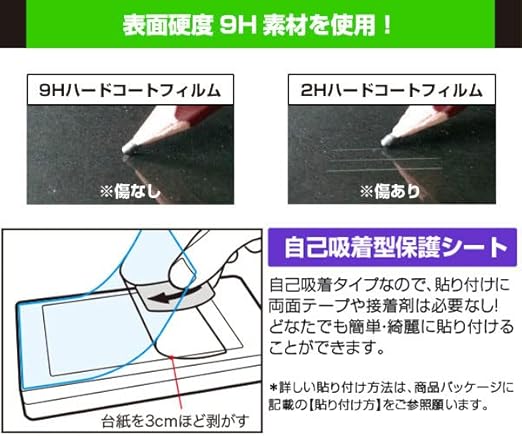 貼っていることを感じさせない透明度、指紋がつきにくいフッ素加工、そして表面硬度9H相当で傷がつきにくい保護フィルムです。