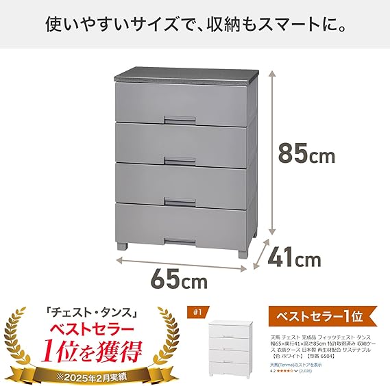 天馬 チェスト 完成品 フィッツチェスト タンス 幅65×奥行41×高さ85cm 特許取得済み 収納ケース 衣装ケース 日本製 再生材配合 サステナブル【色 グレー】【型番 6504】 a