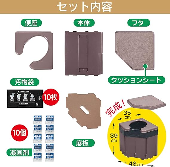 【10回分:目安 1人で2日分相当】本体1個、汚物袋(黒)10袋+凝固剤10個のセット。