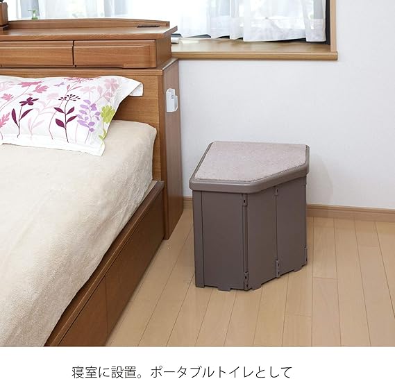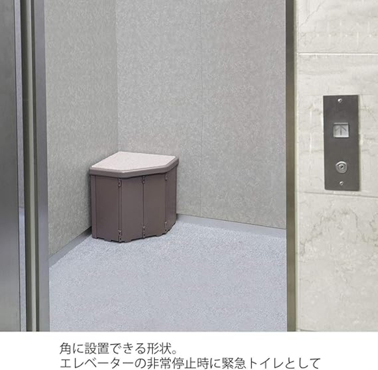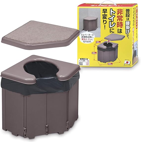 普段は腰掛け、非常時はトイレになる簡易トイレです。コーナー部分に設置できる仕様です。