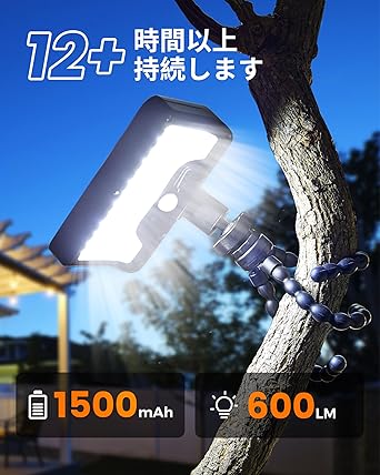 【360°フリー調整&頑丈な三脚デザイン】ランプヘッドの360度角度調整と柔軟なポータブル三脚を採用。凹凸のある壁面やフェンス、木の枝にも隙間なく設置可能。屋外 センサーライトの実
