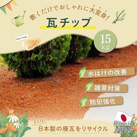 【商品仕様】:内容量約15kg、材質/国産瓦、粒径/約0.3〜1.5cm 環境に配慮し国産の廃瓦を使用した、エコ素材の瓦チップです。入荷時期や個体により色の濃淡やサイズに差が生じます。