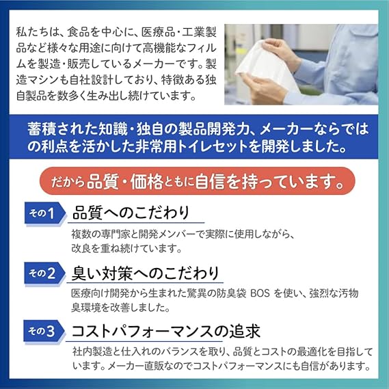 私たちは臭わない袋BOSを製造・販売しているメーカーです。蓄積された知識、独自の開発力、メーカーならではの利点を活かした非常用トイレセットを開発しました。品質・価格に自信を持っています。