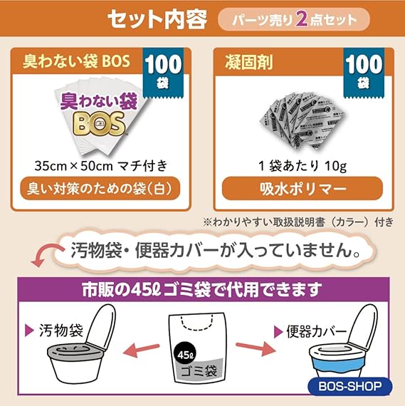 【BOS-SHOP限定品】非常用トイレパーツ2点【防臭袋BOS・凝固剤の2点セット】15年保存 100回分 防災グッズ 災害 簡易トイレ 携帯トイレ【排泄臭の根本解決はBOSだけ】 a
