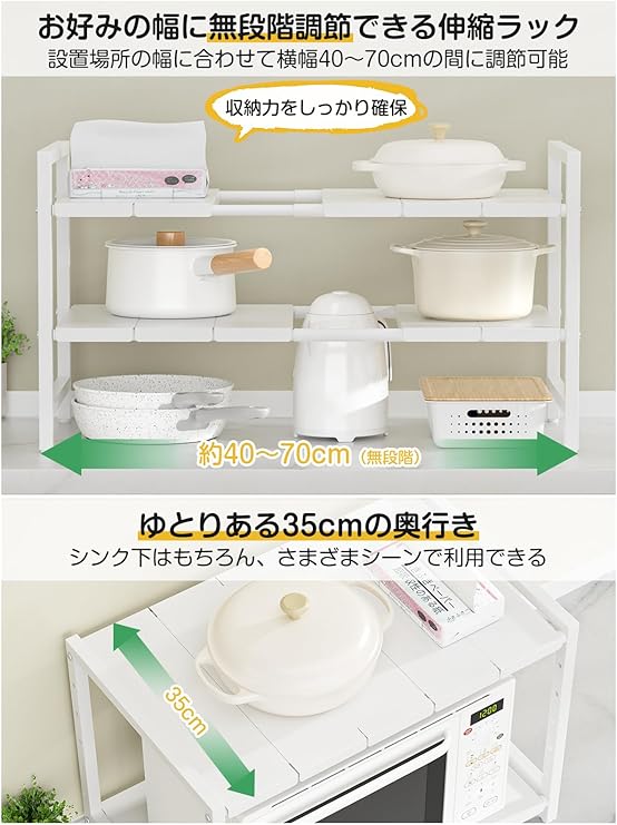 【幅40-70cm伸縮・高さ7段調整】シンク下ラック TKUIN キッチン収納 シンク下フリーラック 奥行35cm 高さ40cm 大容量 2段シンク下収納 洗面台下 収納ラック キッチンラック 台所 整理収納 スチール製丈夫 プレート 流し台下ラック 鍋 食器棚 (White) a