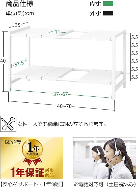 【シンク下収納ラック商品仕様】 サイズ:約幅40〜70×奥行き35×高さ40cm(7段高さ調節)。製品重量:約4.2kg、材質:スチール(粉体塗装)、耐荷重:約40Kg(各段約20Kg)。シンクの下や洗面台の下が整頓できるキッチン収納ラック!伸縮できるから設置場所の幅に合わせて調整できる丈夫なスチール製伸縮棚が2025年新登場!