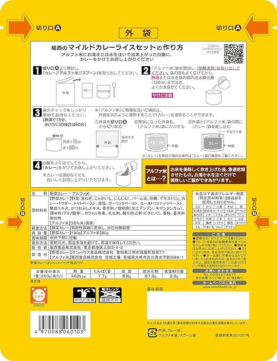 【原材料】【野菜カレー】野菜(玉ねぎ、じゃがいも、に んじん)、パーム油、砂糖、デキストリン、カ レーパウダー、トマトペースト、食塩、ガー リックペースト、ローストココナッツペースト、 酵母エキス、かつおぶしエキス、香辛料/ 増粘剤(加工デンプン、キサンタンガム)、 調味料(アミノ酸等)、カラメル色素、乳化 剤、酸化防止剤(ビタミンC)、香料、香辛料 抽出物 【アルファ米】うるち米(国産)