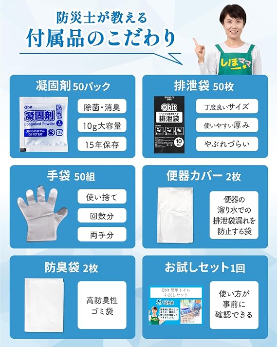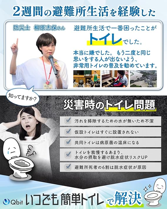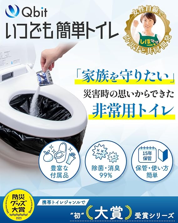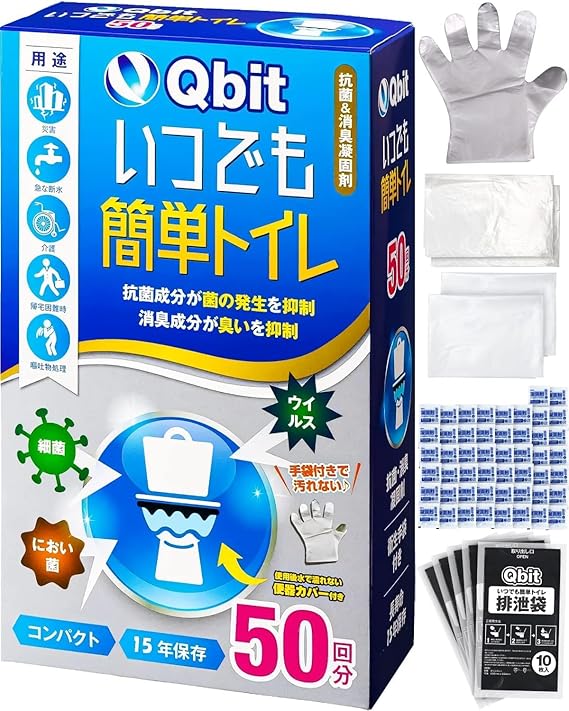 Qbit いつでも簡単トイレ 防災士と共同開発 15年保存 【防災グッズ大賞】 強力消臭 簡易トイレ 防災/災害用/非常用/携帯トイレ 凝固剤10g以上大容量 手袋 防臭袋 付き (50回+お試しセット1個 1人7日分) a