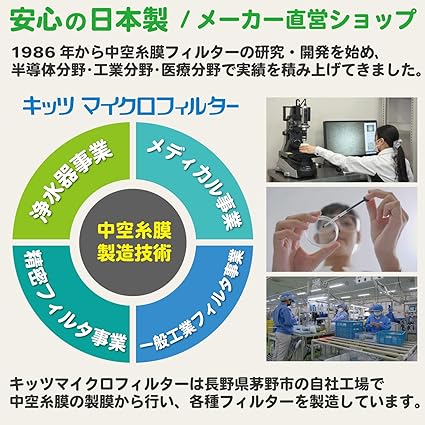 【特長①】安心と信頼の日本製。キッツマイクロフィルターは約40年前から中空糸膜の研究・開発を行っており、その製品はキレイな水が必要とされる半導体や医療機器の製造工程で使われております。このデリオスにも、日本国内の工場で自社製造した中空糸膜フィルターを採用しています。