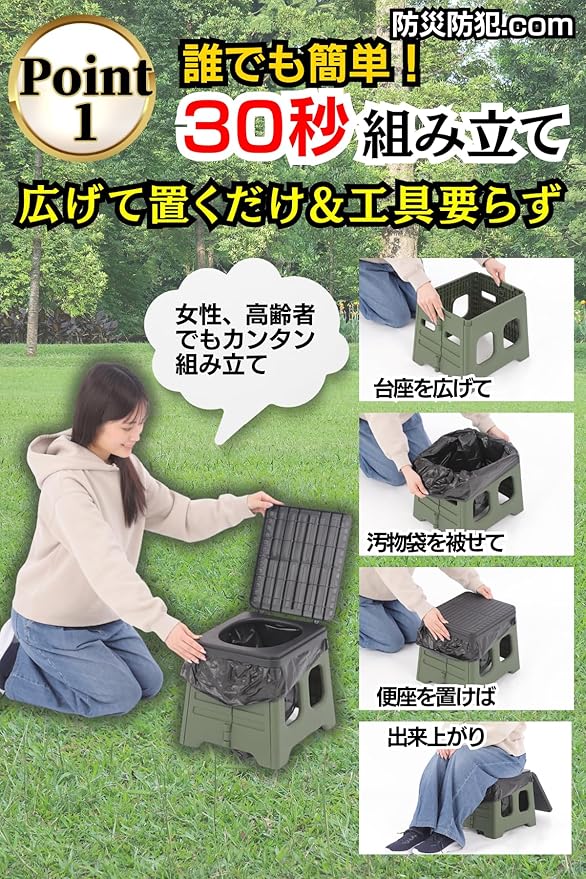 簡易トイレ 防災士監修 【畳むと8cmでコンパクト すぐ使えるフルセット】非常用トイレ ポータブルトイレ 汚物袋 防臭袋 凝固剤 15年保存 防臭 防菌 耐荷重 150kg 携帯トイレ 非常用トイレセット 軽量 収納袋付き 持ち運びカンタン 非常用 災害用 介護 キャンプ 防災グッズ 【防災防犯ブランド ピカジャケ】 (グリーン) a