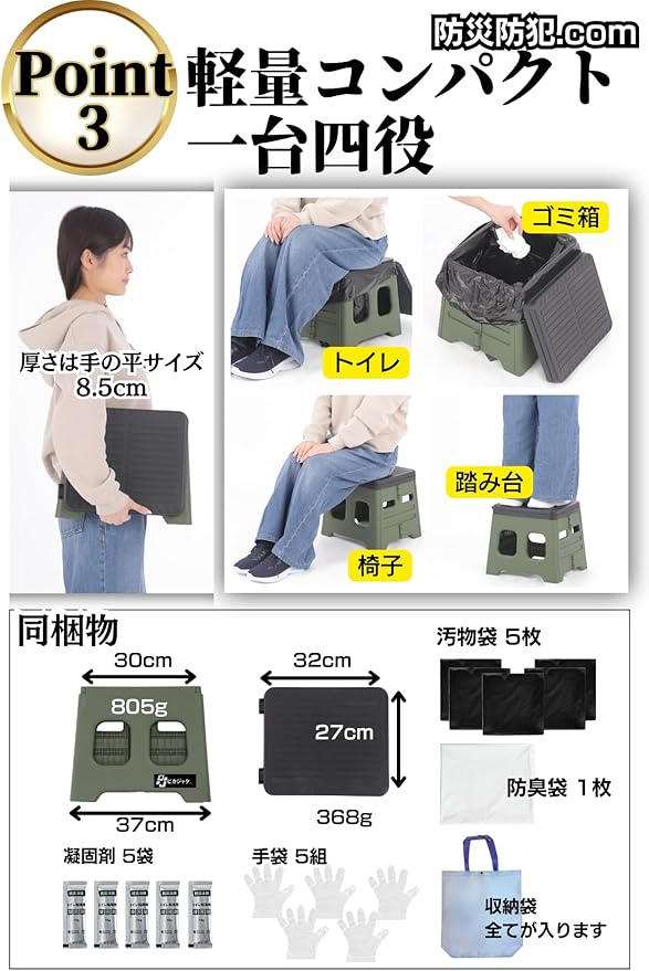 【1台4役】 災害時や断水などの非常時は簡易トイレとして大活躍。平常時はイス・踏み台・ゴミ箱としてもご使用いただけます。室内に置いても違和感がないので「もしもの時」のために防災意識を高めてくれます。水洗い可能で清潔です。
