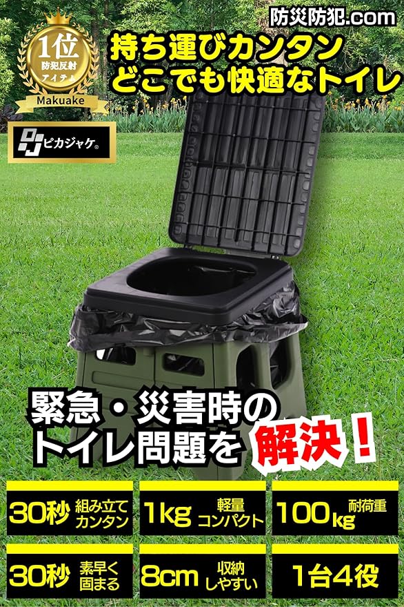 【設置カンタン&超軽量】 本体を広げ、汚物袋と便座を取り付けるだけの折り畳み式の簡易トイレです。10秒で設置・収納が可能です。重さ1.2kgで持ち運びカンタンなポータブルトイレ。【防災防犯ブランドピカジャケ】