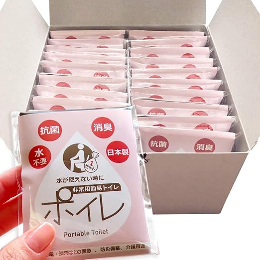 【 特徴 】1回分ずつ個包装された携帯用の簡易トイレセット(非常用トイレ)です。小便・大便どちらにも使用でき、水不要で処理可能な抗菌性凝固剤入り。 アウトドア・登山・キャンプなどの携帯トイレはもちろん、防災リュック・非常用持ち出し袋・避難用品にもおすすめ。 企業・自治体・学校などの配布用防災グッズ、避難所備蓄としても適しています。 災害時に困ることの上位「トイレ問題」対策として、非常食や水と同じくトイレ備蓄をご検討ください。