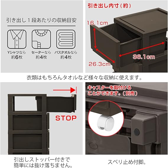 収納目安 ※引出し1段あたりの収納目安 ワイシャツ・6枚 バスタオル・4枚 引出し内寸・(約)W263×D361×H161mm