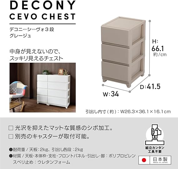 JEJアステージ(JEJ Astage) 収納ケース デコニー シーヴォ 3段 グレージュ 簡単組立 日本製 幅34×奥行41.5×高さ66.1cm a