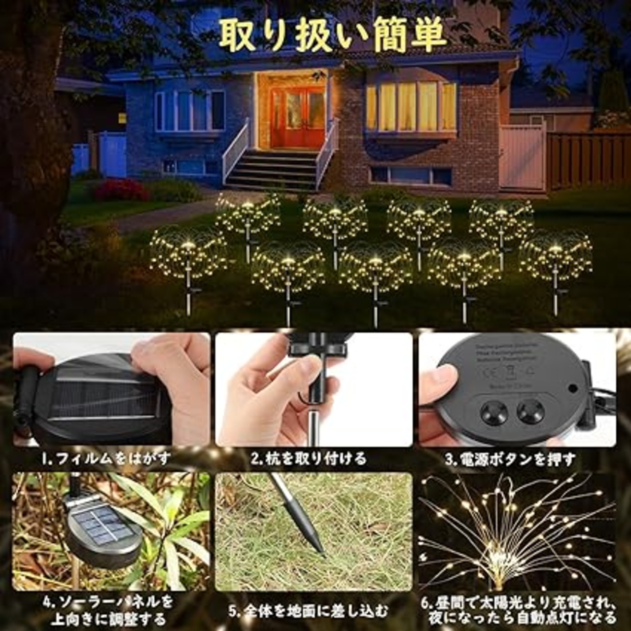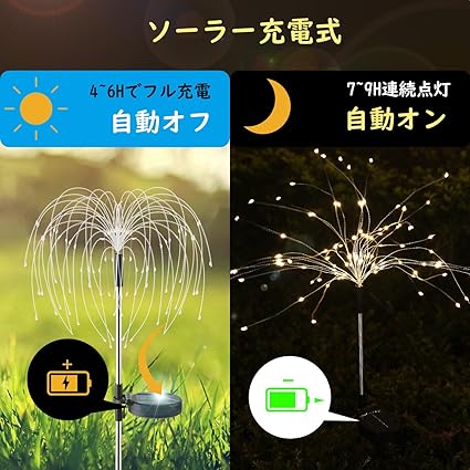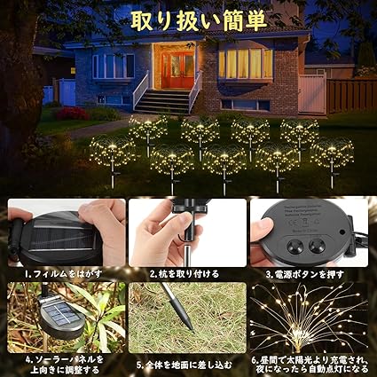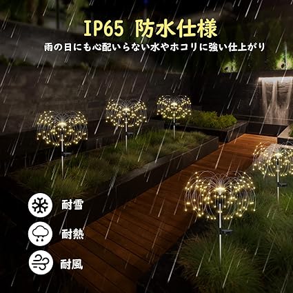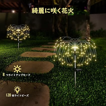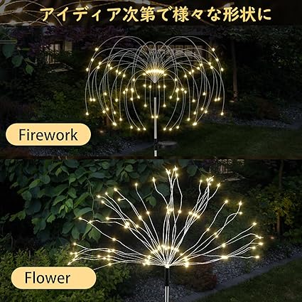 「庭をより華やかに彩る」庭やバルコニーの雰囲気を一気に変えられる花火のように放射線状になるガーデンライトとなります。庭やガーデンに取り入れることで、暖かみのある光があふれる幻想的な雰囲気を作れるほか、防犯対策にも一役に立ててくれます。