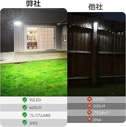 600LM超高輝度&広範囲照明:92個の高品質LED搭載で、600ルーメンの明るさを実現。最大5mの感知距離と120°の広いセンサー角度で、庭や玄関を明るく照らします。