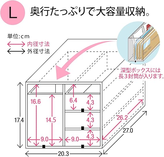 【深型ボックス内寸】W90×D262×H145mm 【小物トレー内寸】W90×D262×H43mm