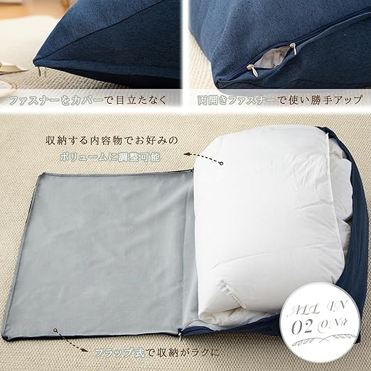 「クッションになる布団収納ケース」収納とインテリアを両立する快適な空間づくりを実現。ナチュラルな色合いの高品質な生地で、来客時にも生活感なく空間に溶け込みます。布団収納だけでなく、インテリアとしても優れたデザインです。