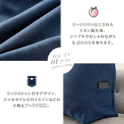 「製品詳細」サイズ52X68X26cm。ポリエステル100%の高品質な生地を使用。リネン風の見た目と柔らかな手触りが特徴で、ピーチスキン加工によってさらに柔らかさが増しています。耐久性が高く、日常使いにも最適です。