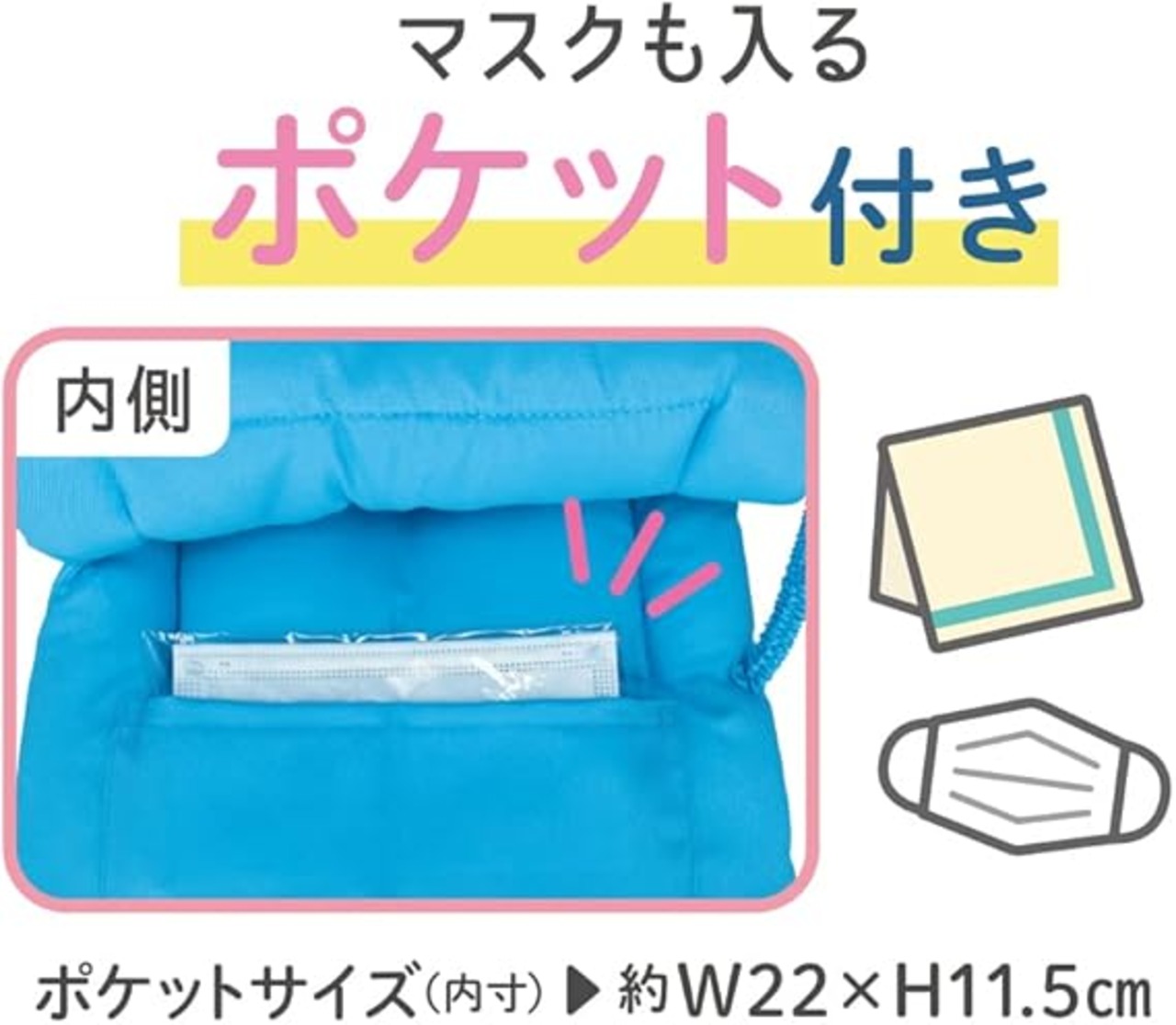 【特徴】中綿たっぷりで衝撃にも強く、生地は難燃加工素材を使用した防災ずきん。内側にはマスクも入るポケット付き