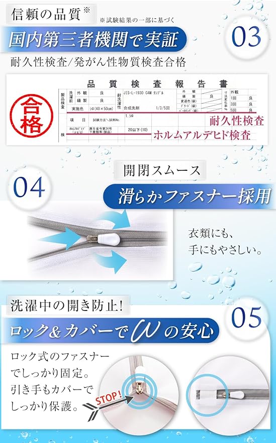 【掃除専門プロの家事代行業者 推薦】HOLOMUAの洗濯ネットは毎日快適な洗濯をして頂くために日本企業が商品開発を行っています。繊細な衣料品なども洗濯や乾燥機の摩擦でも痛まない高品質のポリエステル繊維を採用しました。網目がとても細かいため「型崩れを防ぎたい」「生地を守りたい」など繊維を傷めず衣類をやさしく守ります。
