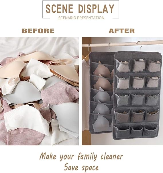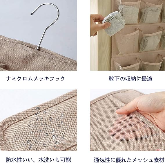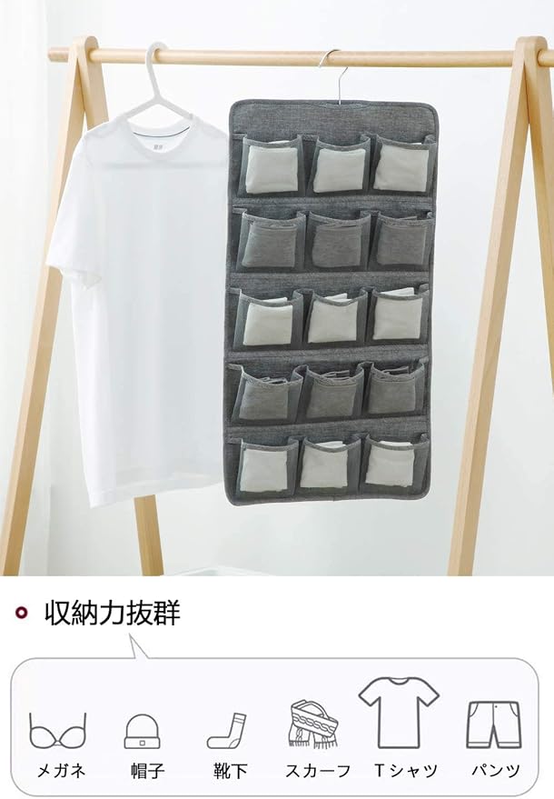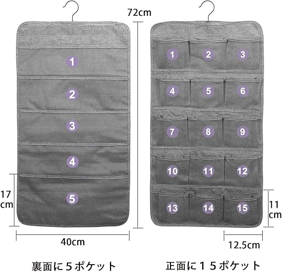 1. 両面使えて、たくさん収納できます。20ポケットで大きいものから小さなものまで収納できます。表は15ポケットあるから小分けに収納で、下着や靴下に最適です。裏面は大きめのポケットが5ポケットあり、ブラジャーの収納に最適。大きめのブラでもしっかり入ります。男性の方はハンカチ収納としてお使いください。