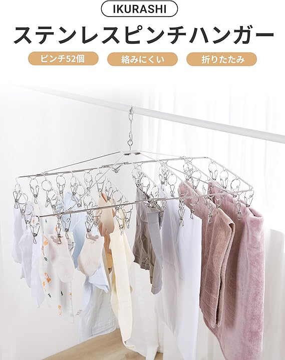 【Amazon.co.jp 限定】アイクラシ(Ikurashi) ピンチハンガー 52ピンチ 角ハンガー 引っ張るだけ ステンレス 洗濯ハンガー 洗濯ピンチ 洗濯 大きい タオル(15個予備ピンチ付) a