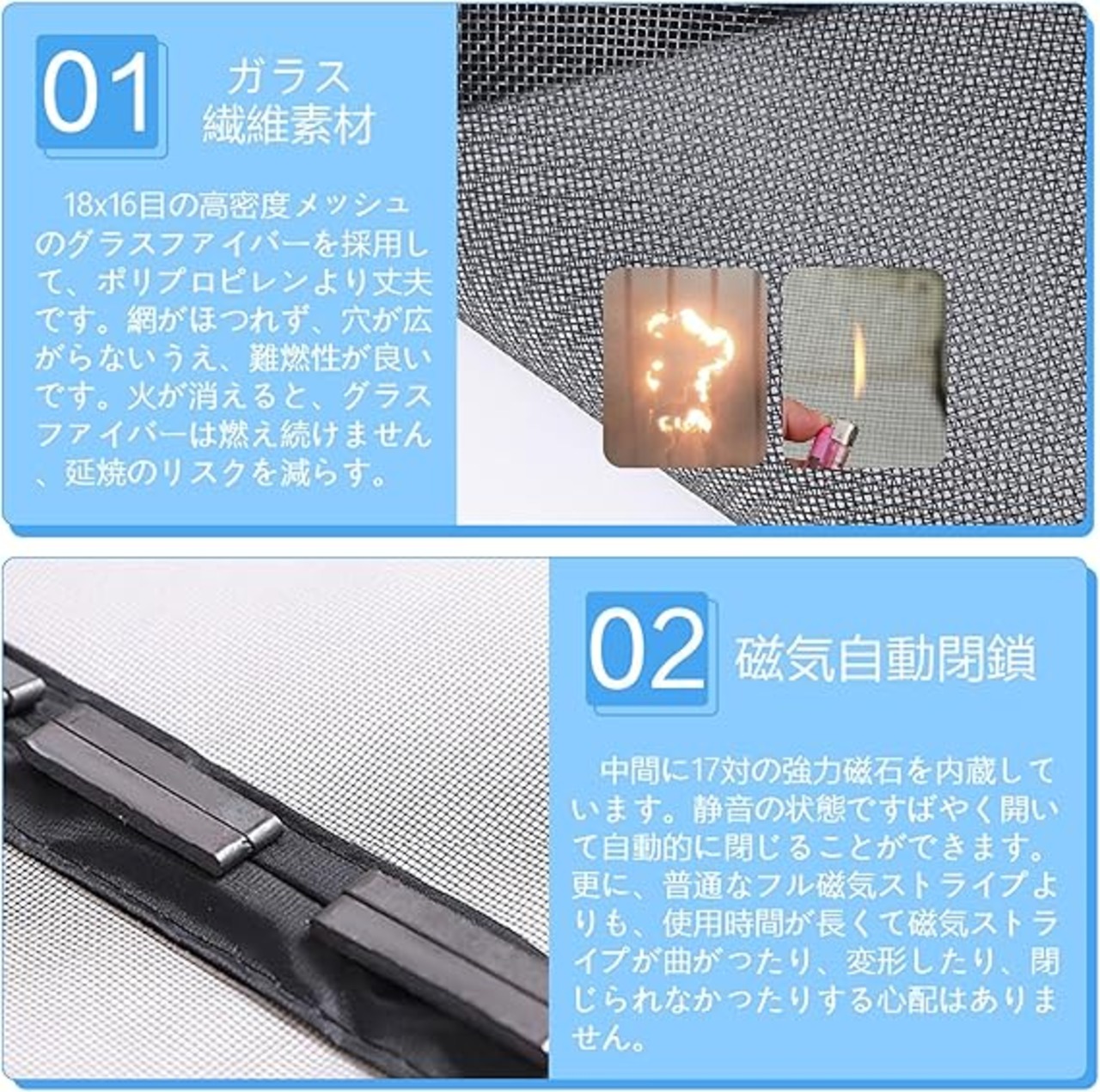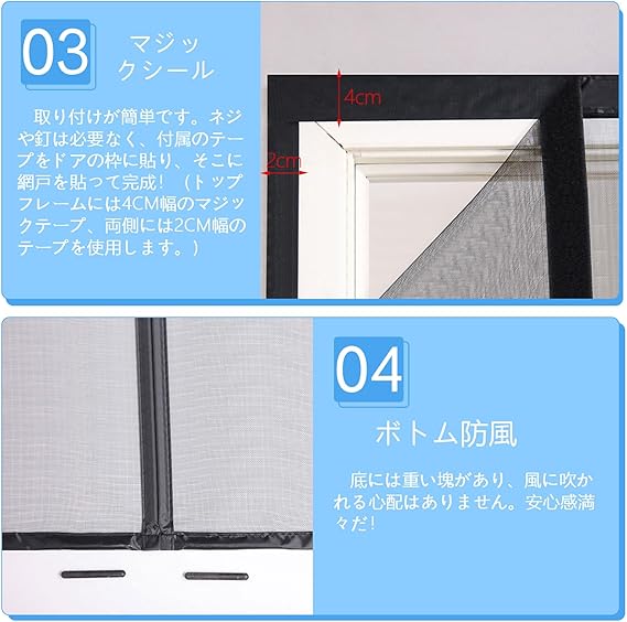 【磁気自動閉鎖】中間に17対の強力磁石を内蔵しています。静音の状態ですばやく開いて自動的に閉じることができます。 お子様やペットは自由に通行できます。更に、普通なフル磁気ストライプよりも、使用時間が長くて磁気ストライプが曲がったり、変形したり、閉じられなかったりする心配はありま