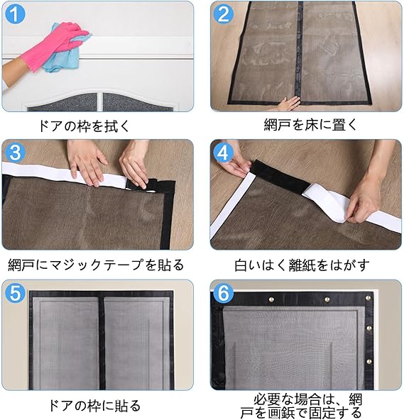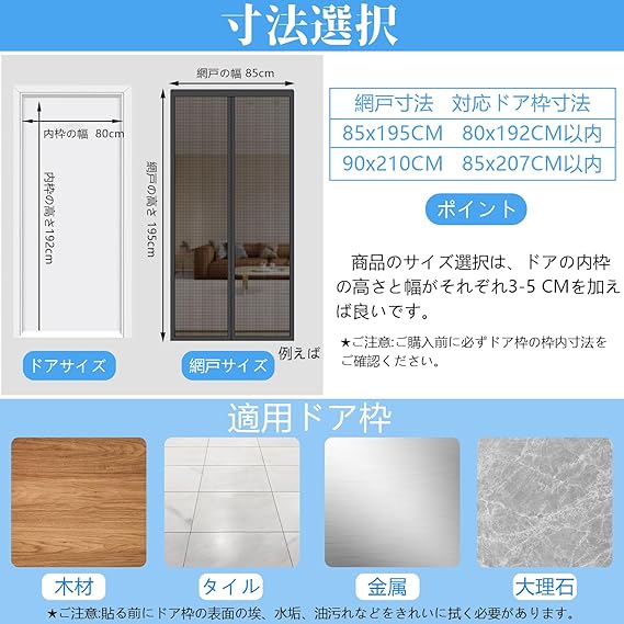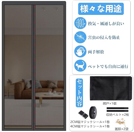 【網戸寸法】:85CM幅x195CM高さ/【対応ドア枠寸法】:80CM幅/192CM高さ以内。【セット内容】網戸×1個?収納ベルト×2枚?画鋲?2CM幅マジックシール×1巻?4CM幅マジックシール×1巻?取付説明書×1枚