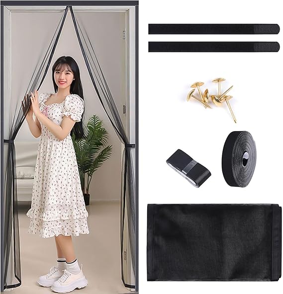 FINGOOO 玄関網戸 マグネット ドア用 【中開き ガラス繊維】 網戸カーテン 後付け 収納バックル付き 簡易 虫除け 換気対策 静音仕様 自動で閉まる ベランダ 引き戸 勝手口 掃き出し窓 入り口用 黒 (85×195CM) a