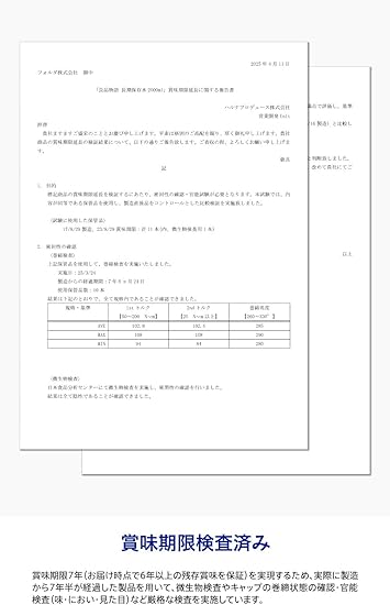 【7年の賞味期限】微生物検査、官能検査をはじめとした、徹底した衛生管理を行ない、製造から7年間の賞味期限を保証しています。ご購入後、6年以上の賞味期限が残るようにお届けします。