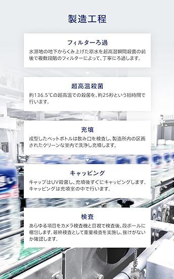 【衛生管理された高い品質の長期保存水】汲み上げた源水は、超高温加熱処理により殺菌
