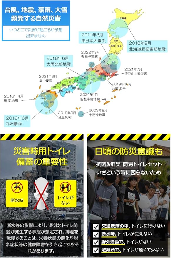 【防災士が監修!実体験から生まれた非常用トイレセット】災害時のリアルなニーズに基づき、防災士の監修で設計された信頼の防災トイレ。地震・豪雨・停電など緊急時はもちろん、介護や車中泊でも活躍。凝固剤・汚物袋・防臭袋・手袋をワンセット化し、設置から処理まで簡単・衛生的。使用後はそのまま可燃ゴミへ。