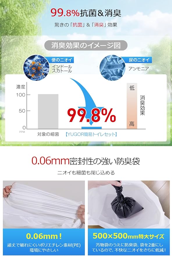 【強力吸水&消臭凝固剤で衛生キープ】高吸水性ポリマーを使用した凝固剤(1包8g)は最大2000mlまでの排泄物をしっかり固め、雑菌の繁殖や悪臭の拡散を防ぎます。圧力がかかっても漏れない高分子素材で、不快感を