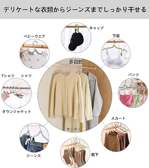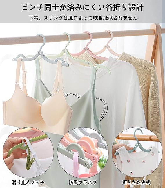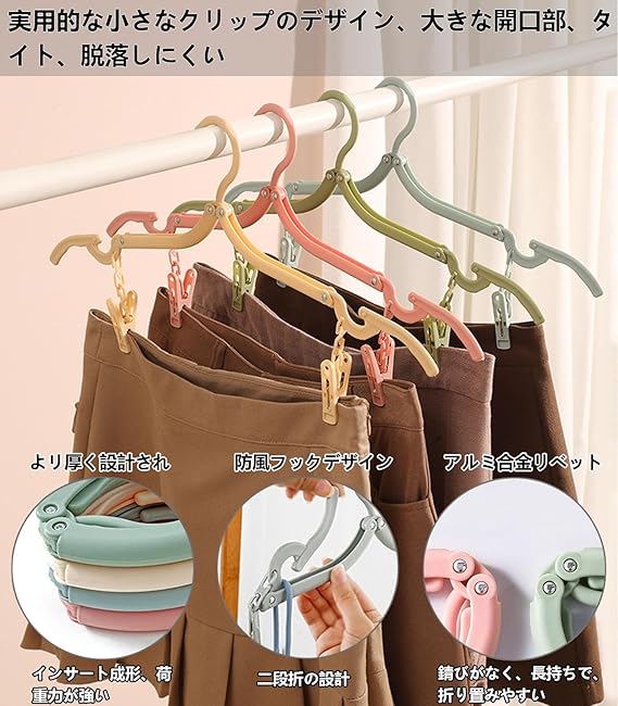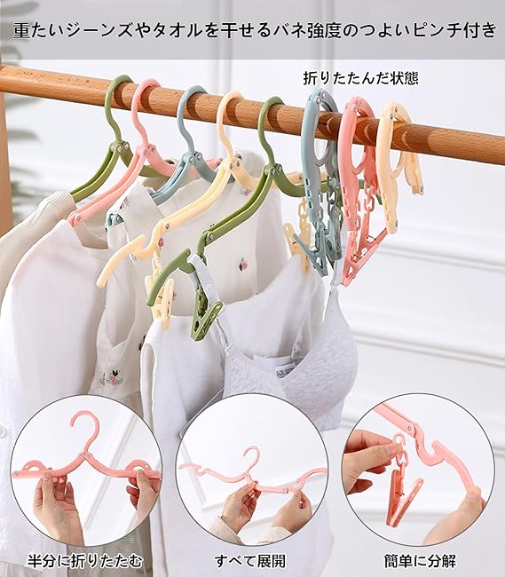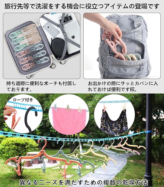 【携帯ハンガーの商品仕様】折り畳み式ハンガー12個、緑・黄色い・青い・ピンク (各色3本)。ピンチ8個付き(各色6本),取り外し可能なクリップ。ロープ(1本)。サイズ(全開):幅44cm、(半開き):幅24.5cm、(折り畳み):13cm×7.5cm。