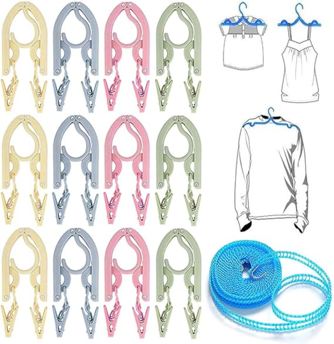 hengshao 旅行ハンガー 折りたたみハンガー 携帯ハンガー 旅行 洗濯 物干し 12個入 洗濯ロープ1本 旅行用ハンガー セット 折りたたみ式 ハンガー 軽量 出張など 便利 4色 ピンチ24個付き a
