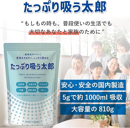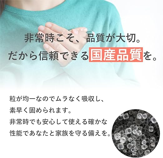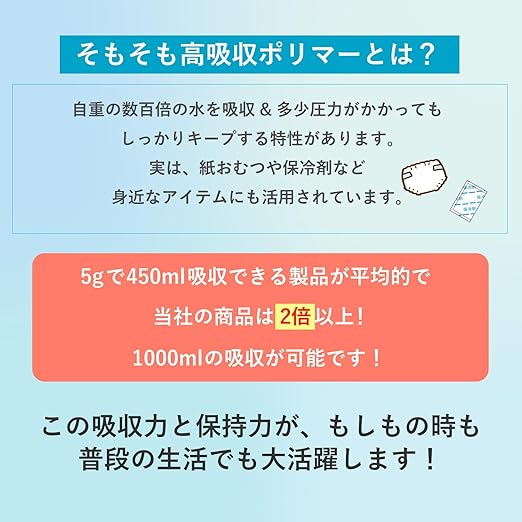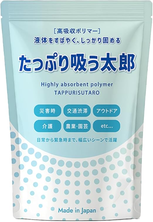 【日本製・Made in Japan】品質にこだわった日本製の吸収ポリマー。高い品質基準をクリアし、いざという時にしっかり機能するよう設計されています。 たっぷり吸う太郎は品質管理、衛生管理を徹底したISO認証取得工場で製造されています。厳格な基準をクリアした製品のみをお届けしますのでご安心してご利用いただけます。