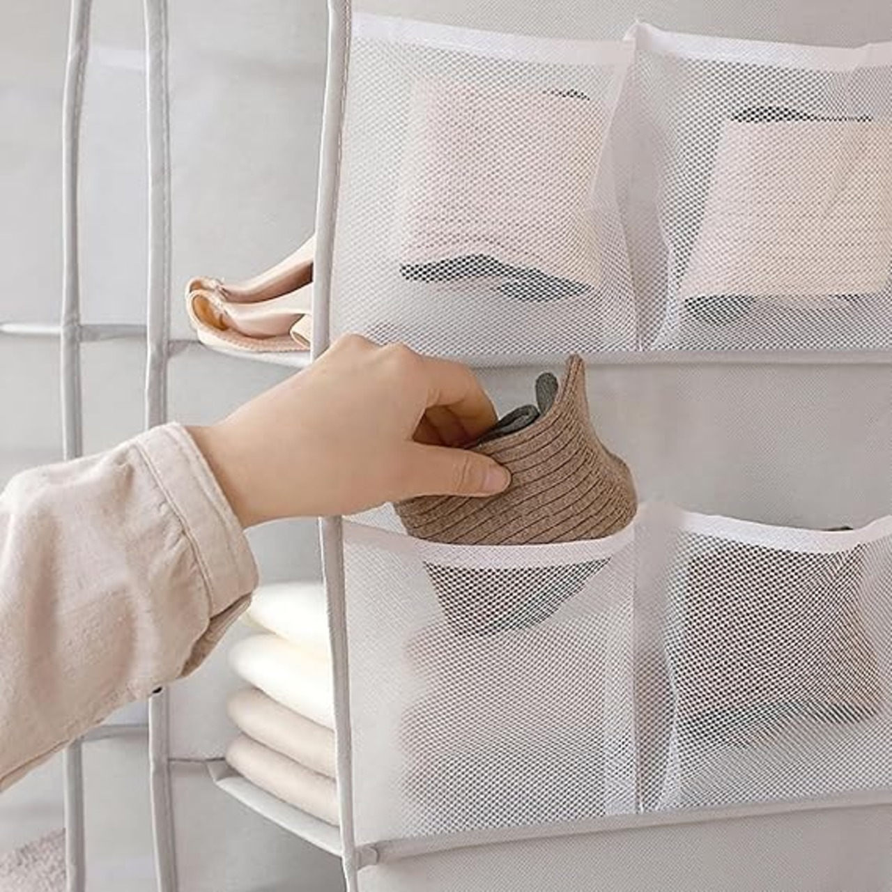 【両ポケットデザイン】左右にも収納袋があり、小さな衣類を収納できます。
