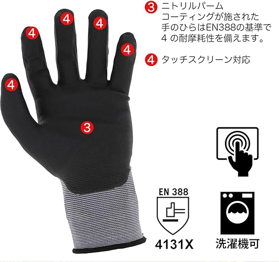 ニトリルパームコーティングが施された手のひらはEN388のレベル4の耐摩耗性。