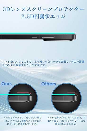 【特徴1】2.5Dラウンドエッジ加工、HD画面、硬度9H、透過率99%、撥油性 疎水性 指紋防止 耐衝撃、気泡ゼロ 貼り付け簡単な保護フィルム です。