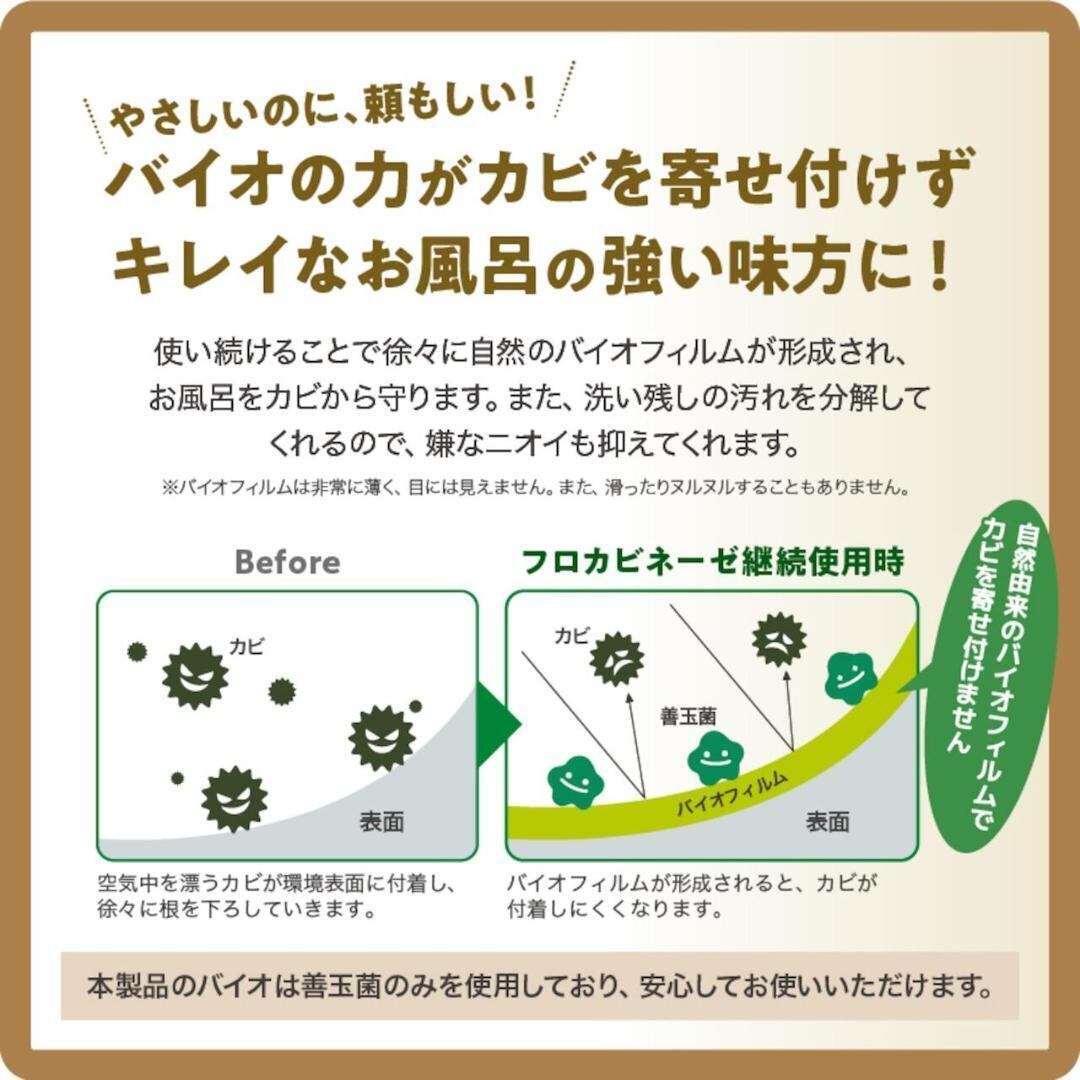 プロの清掃事業者様向けの「業務用バイオ防カビ洗剤 フロカビネーゼ」も「カビが生えにくくなった」「カビ取りが減って楽になった」といったお声を頂いております。この度、一般のご家庭向けに、プロ向けの品質はそのままに自然のやさしさを大切にした商品として発売しました。