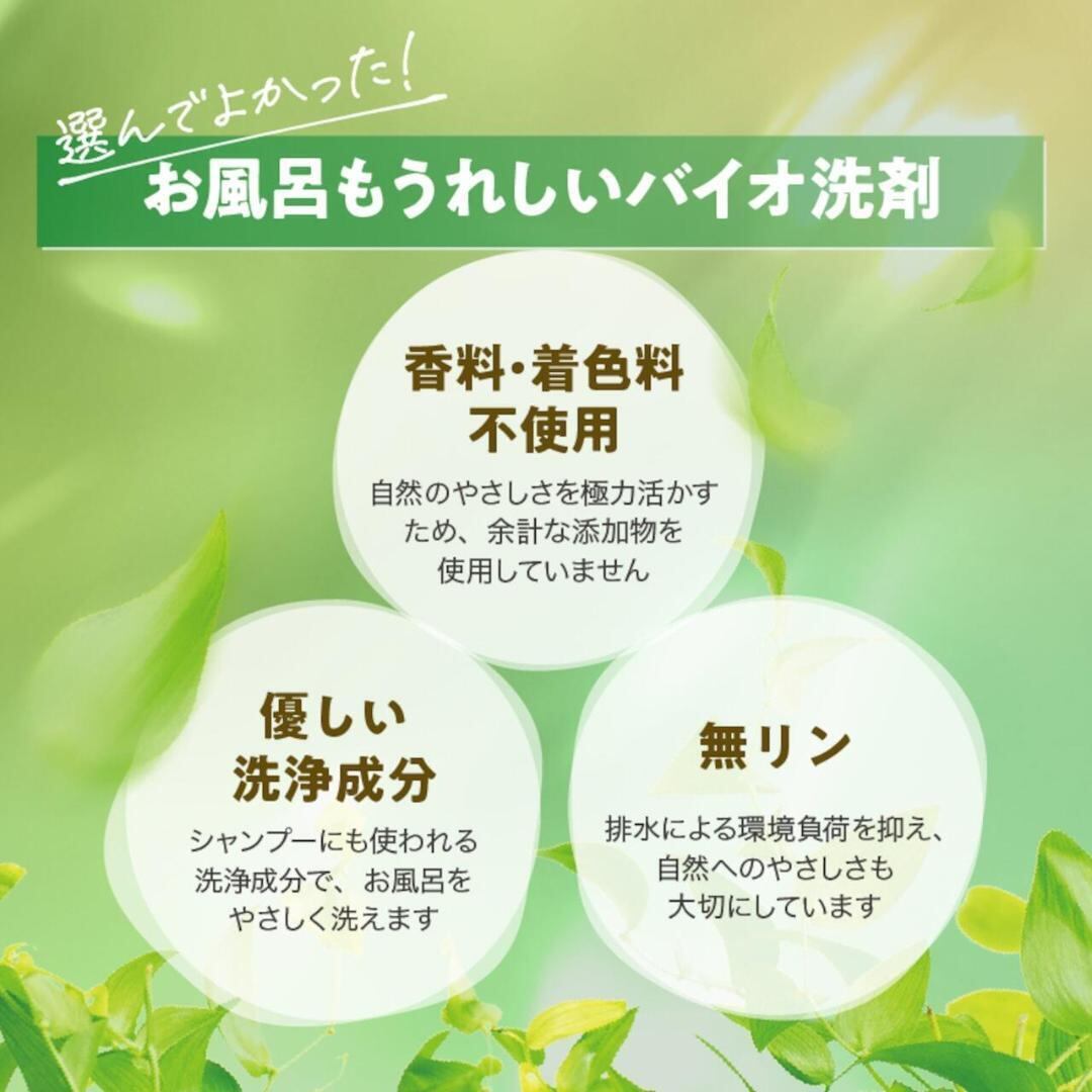 シャンプーにも使われる洗浄成分でお風呂をやさしく洗えるほか、「香料・着色料不使用」「無リン」で余計な添加物の使用を抑えています。お風呂を自然のやさしさで包み、気持ちよくととのえます。